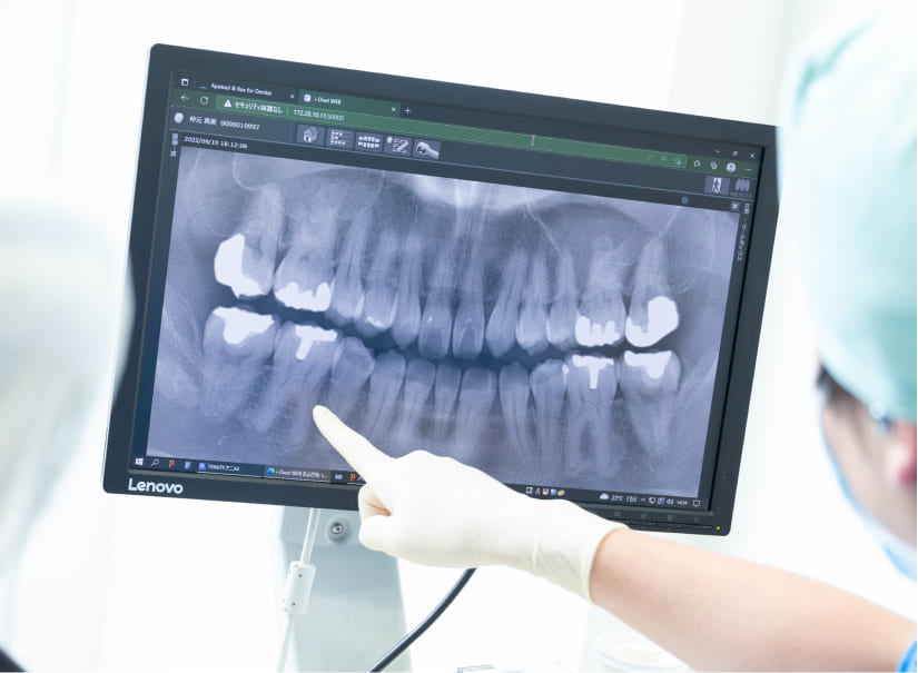 レントゲン、歯周ポケット検査、口腔内写真撮影などを行い、現在の状態を詳しく調べます。